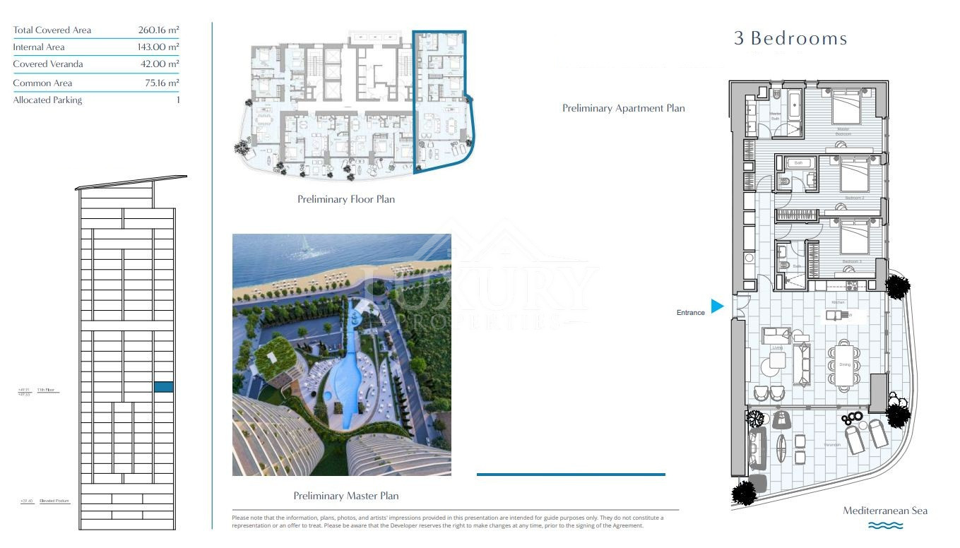 Spanning a generous 260.16 sqm of total covered area, internal area 143sqm, covered veranda 42sqm and common area 75.16sqm the residence offers an open-plan living and dining layout bathed in natural light, flowing seamlessly onto a spacious private terrace overlooking the endless blue of the Mediterranean. It’s the perfect space for relaxing mornings, al fresco dinners, or sunset gatherings with loved ones.