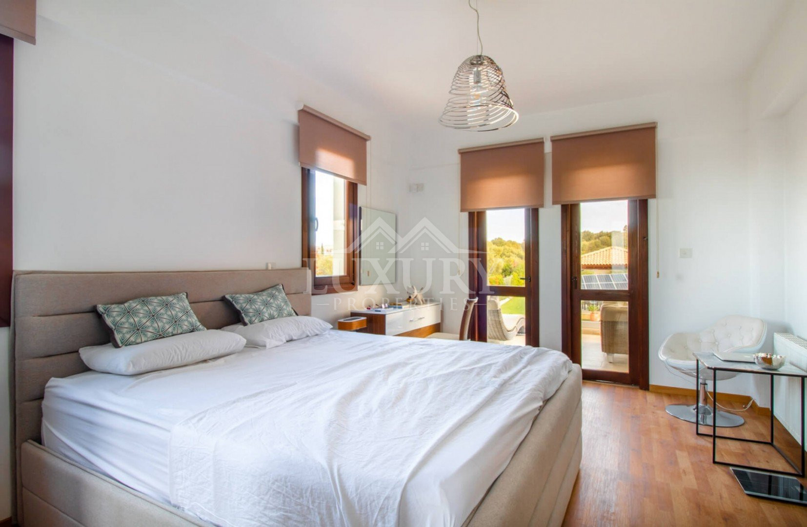 The villa features 4 spacious bedrooms, each with an en-suite bathroom and fitted wardrobes. The master bedroom includes a private terrace and a large en-suite bathroom.