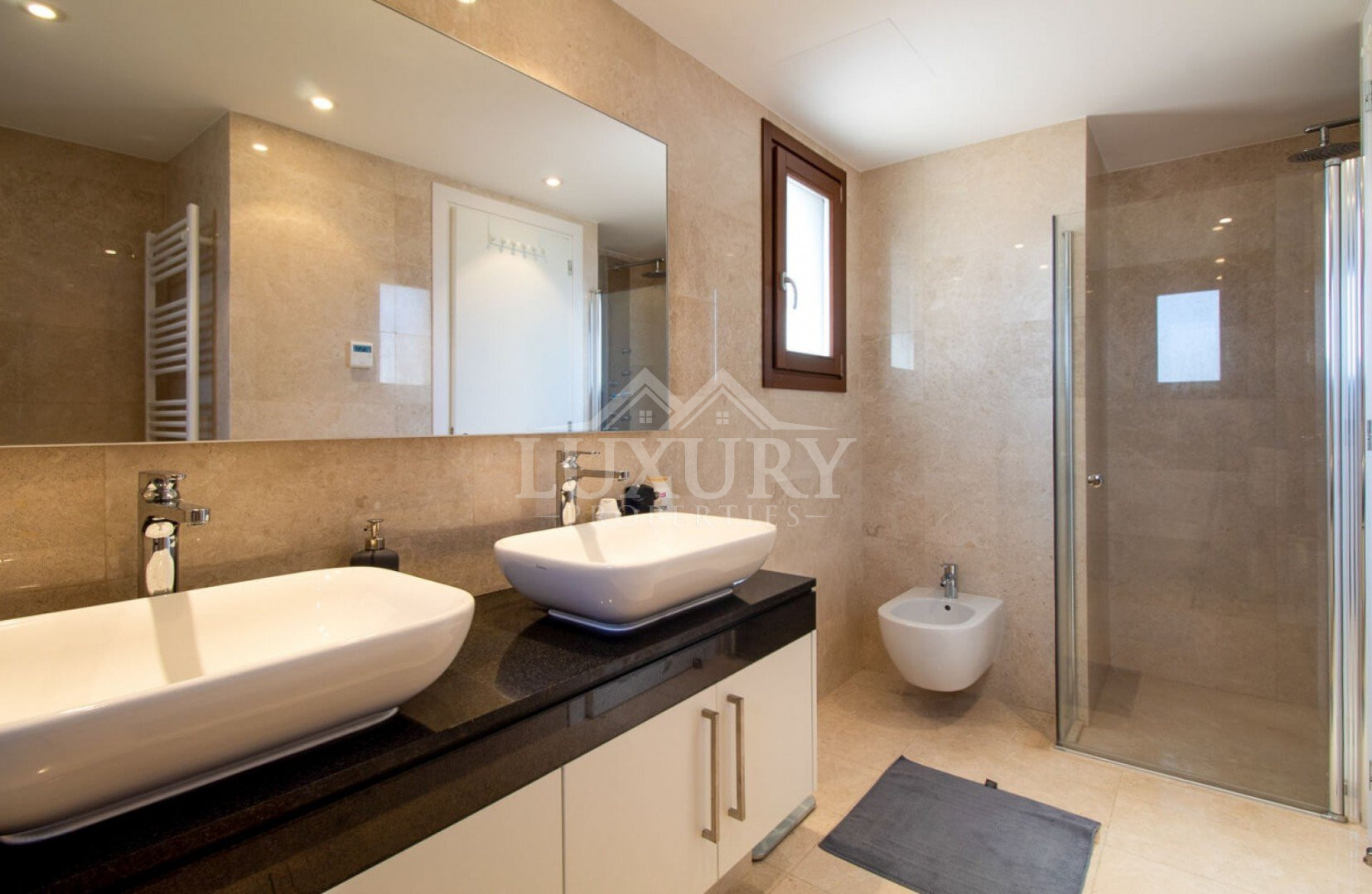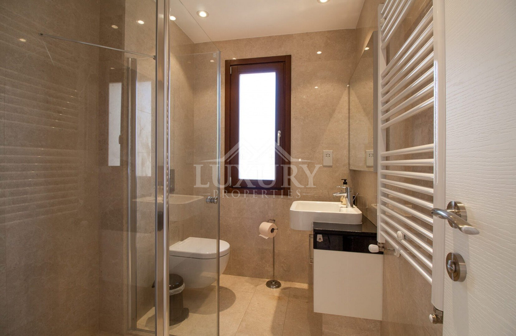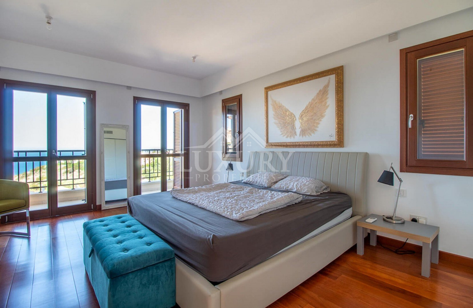 A marble staircase leads to the first floor, where three additional bedrooms enjoy wide-sweeping sea views. The master suite is exceptional, offering a luxurious king-size bed and French doors that open onto a private balcony overlooking the coastline. The elegant en-suite bathroom, fully tiled in granite, includes twin washbasins, a WC, a bath, and a separate shower.