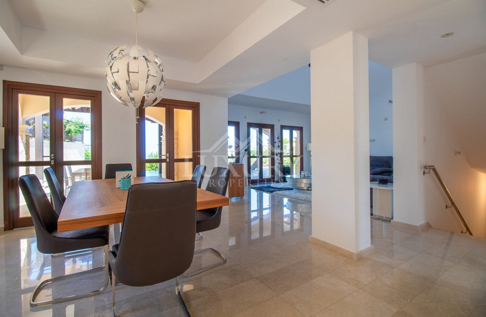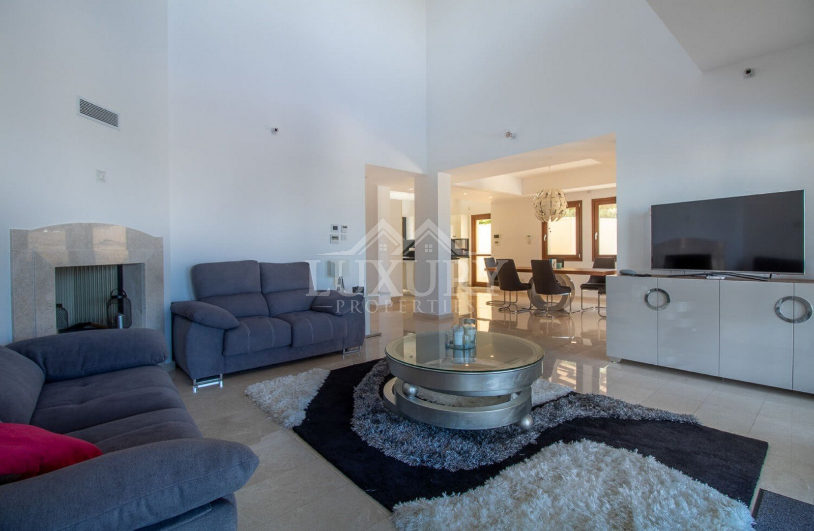 Inside, the villa is lavishly furnished with stylish décor, sumptuous fabrics, and rich color tones that create a true sense of opulence. The modern kitchen features sleek high-gloss cabinetry, premium worktops, and top-quality appliances including a large fridge-freezer, electric oven, hob, and dishwasher.