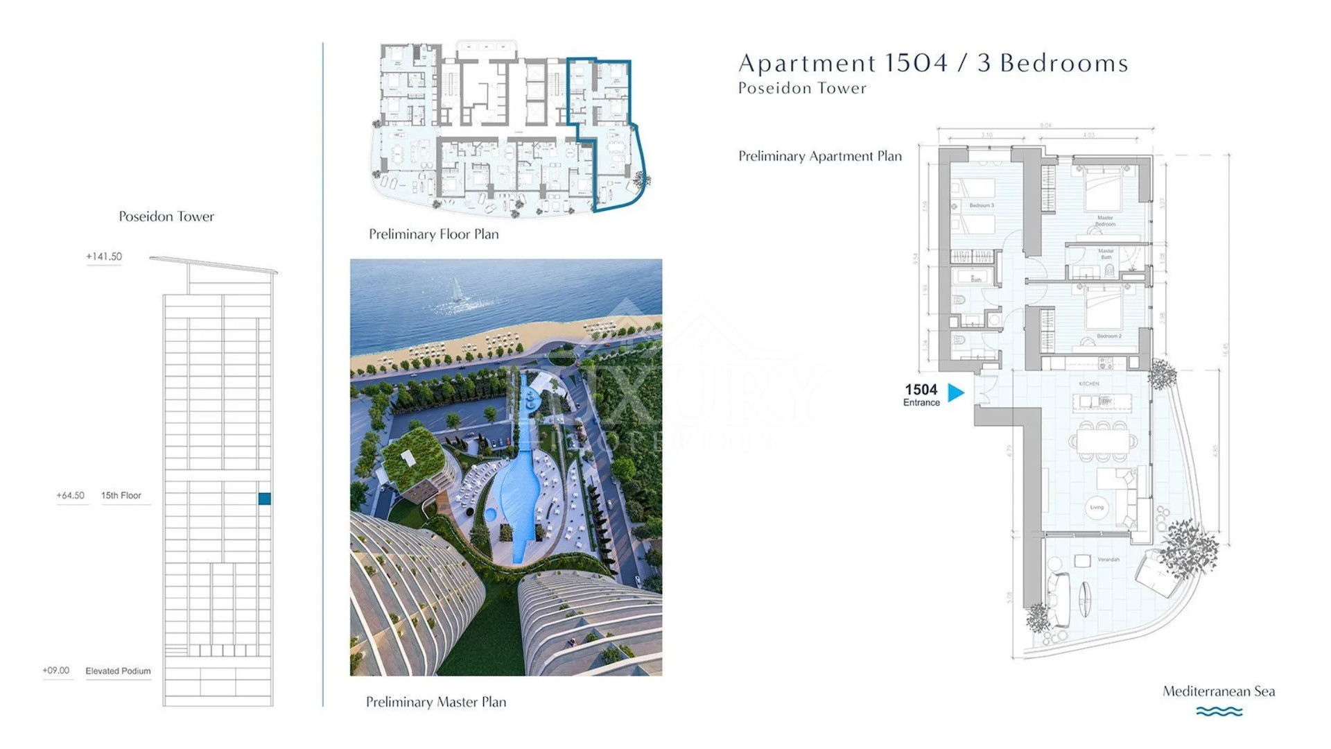 Luxury 3 bedroom seafront apartment near Limassol Marina on the 15th floor with panoramic Mediterranean views, 222.40 sq.m total area, premium resident amenities, and delivery on 1st October 2026.
