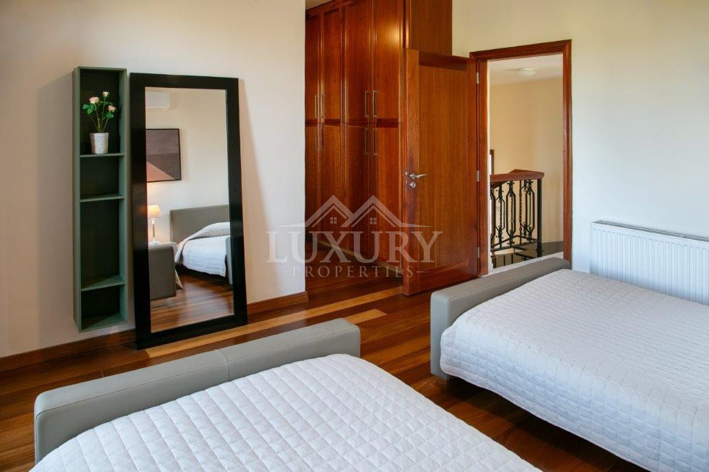 Across multiple levels, the villa features five double bedrooms, each with en-suite bathrooms and fitted wardrobes. The beautifully designed outdoor space includes a 6×10m heated overflow pool with Roman steps, Jacuzzi jets, and a cross-current swimming system, complemented by an additional Jacuzzi tub and a serene steam room. Landscaped gardens, shaded dining areas, a BBQ setup, and a bar counter create the perfect environment for relaxation and entertaining.