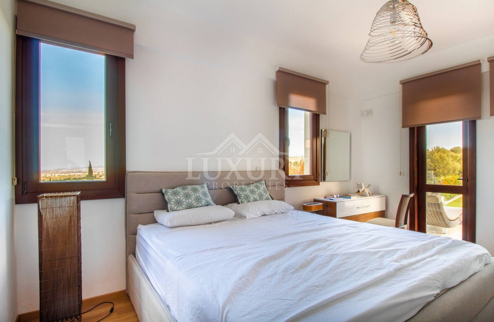 The villa features 4 spacious bedrooms, each with an en-suite bathroom and fitted wardrobes. The master bedroom includes a private terrace and a large en-suite bathroom.