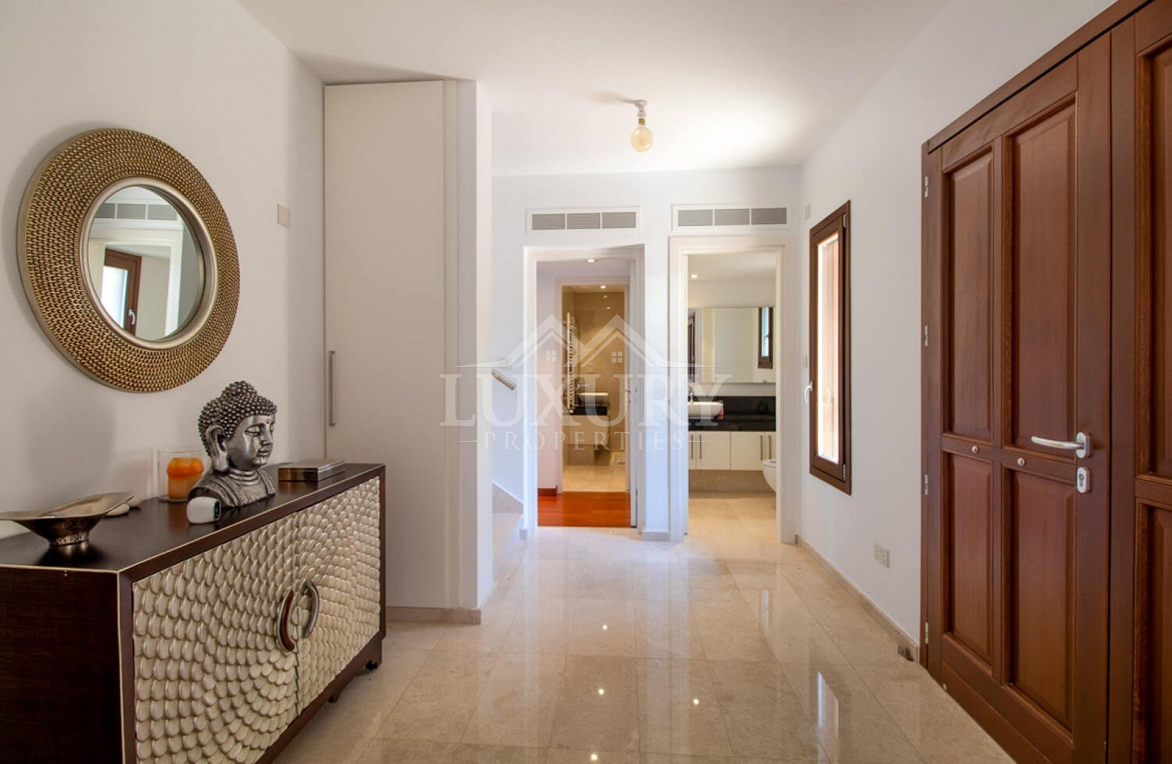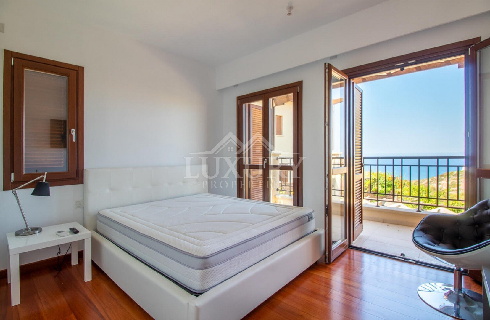A marble staircase leads to the first floor, where three additional bedrooms enjoy wide-sweeping sea views. The master suite is exceptional, offering a luxurious king-size bed and French doors that open onto a private balcony overlooking the coastline. The elegant en-suite bathroom, fully tiled in granite, includes twin washbasins, a WC, a bath, and a separate shower.